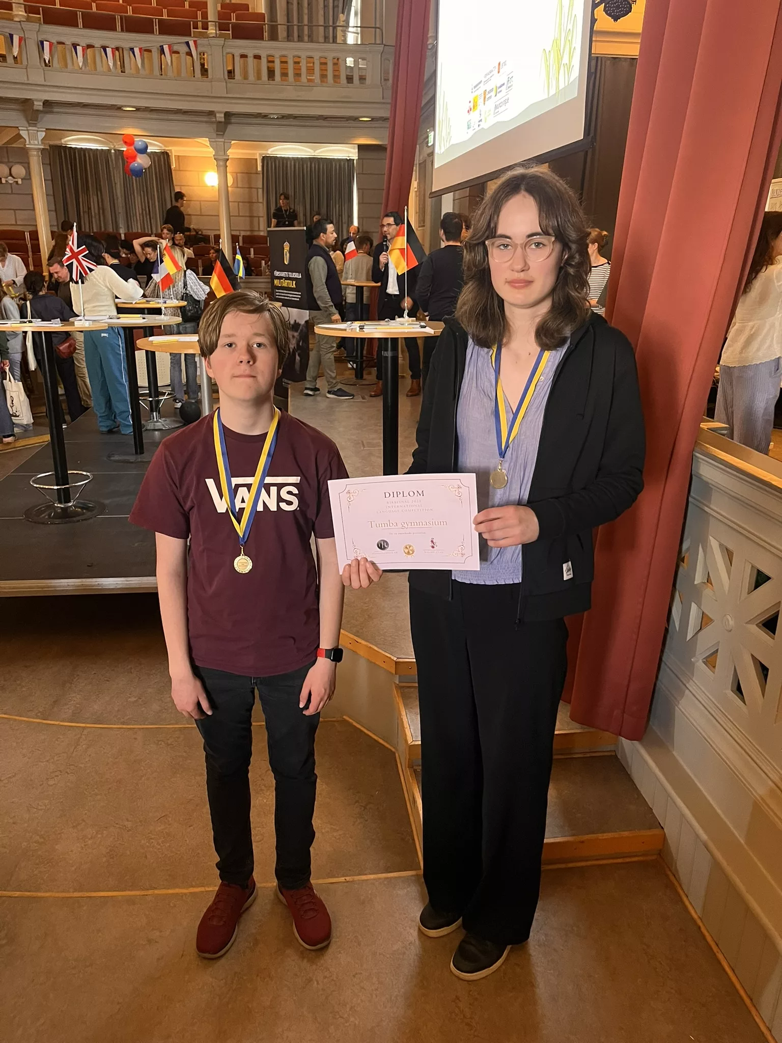 Efter att ha tagit TG vidare till riksfinalen i tävlingen International Language Competition var det idag dags för avgörandet. 30 000 elever har tävlat i olika språk och dagens finaler i tyska och engelska var minst sagt utmanande. Kristian (HU24) och Ingrid (HU22) gjorde en lysande insats i tyskan och hamnade på en femteplats. Nellie (HU22) och Sebastian (ES23BILD) upprepade därefter samma bedrift i engelska. Att Tumba Gymnasium är en språkstark skola råder det inga tvivel om. Ett grattis till alla elever som genom kvalomgången bidrog till att TG tog sig ända till riksfinalen i denna utmanande tävling.